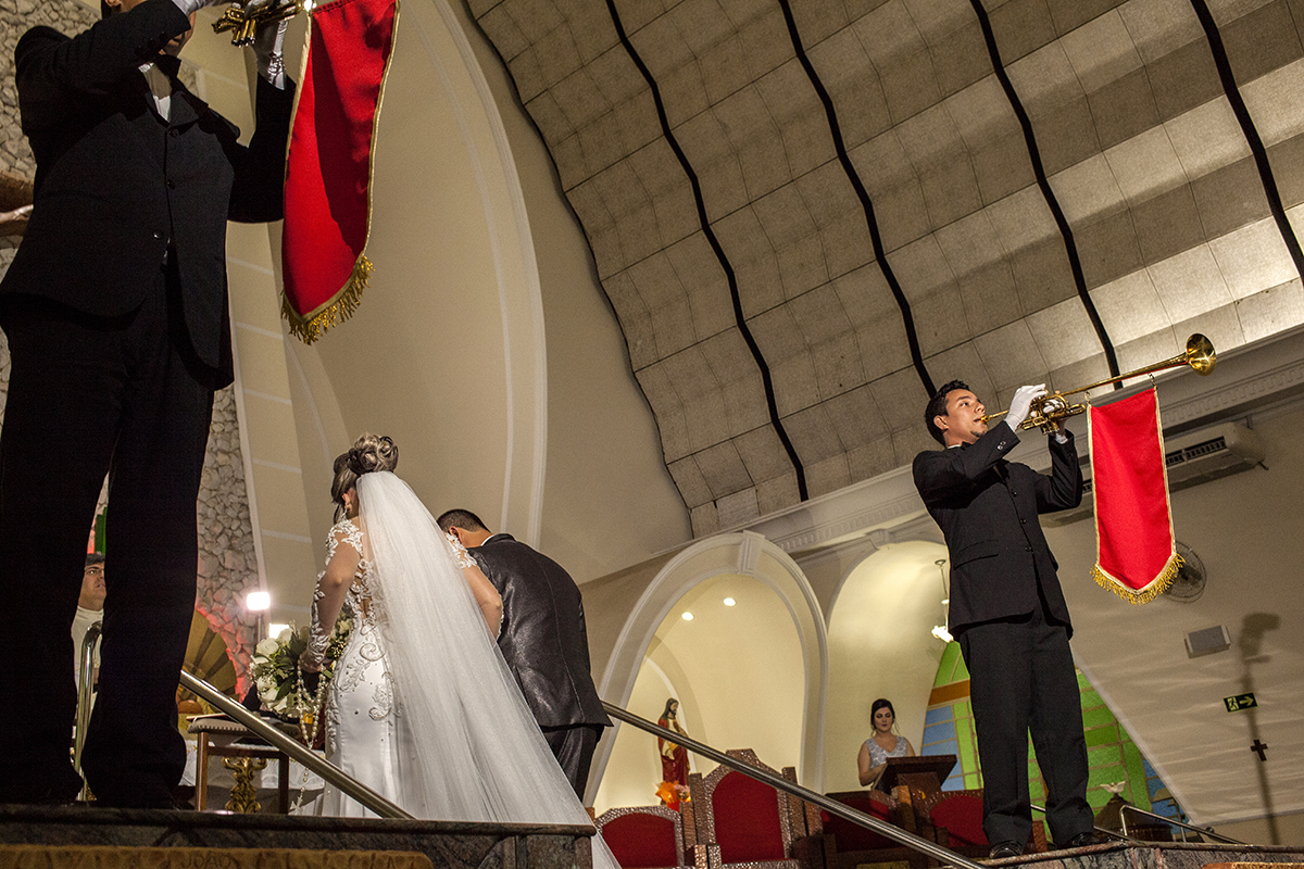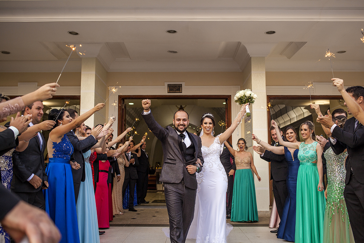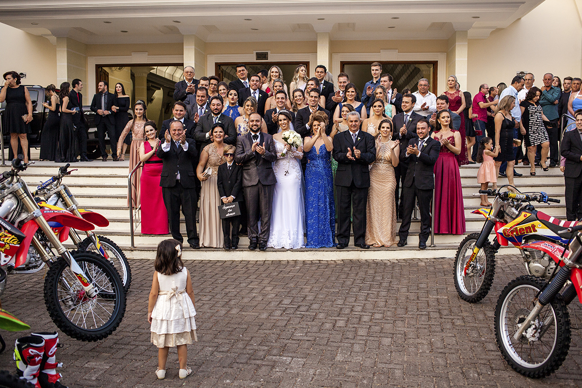Na saída da igreja os noivos foram recepcionado pelos amigos com muita energia, com aplausos e ao som dos motores...